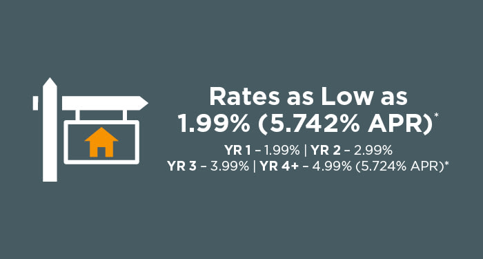 *FHA – YR 1 1.99%-YR 2 2.99%-YR 3 3.99%-YR 4+ 4.99% (5.724% APR) based on 3.5% down payment