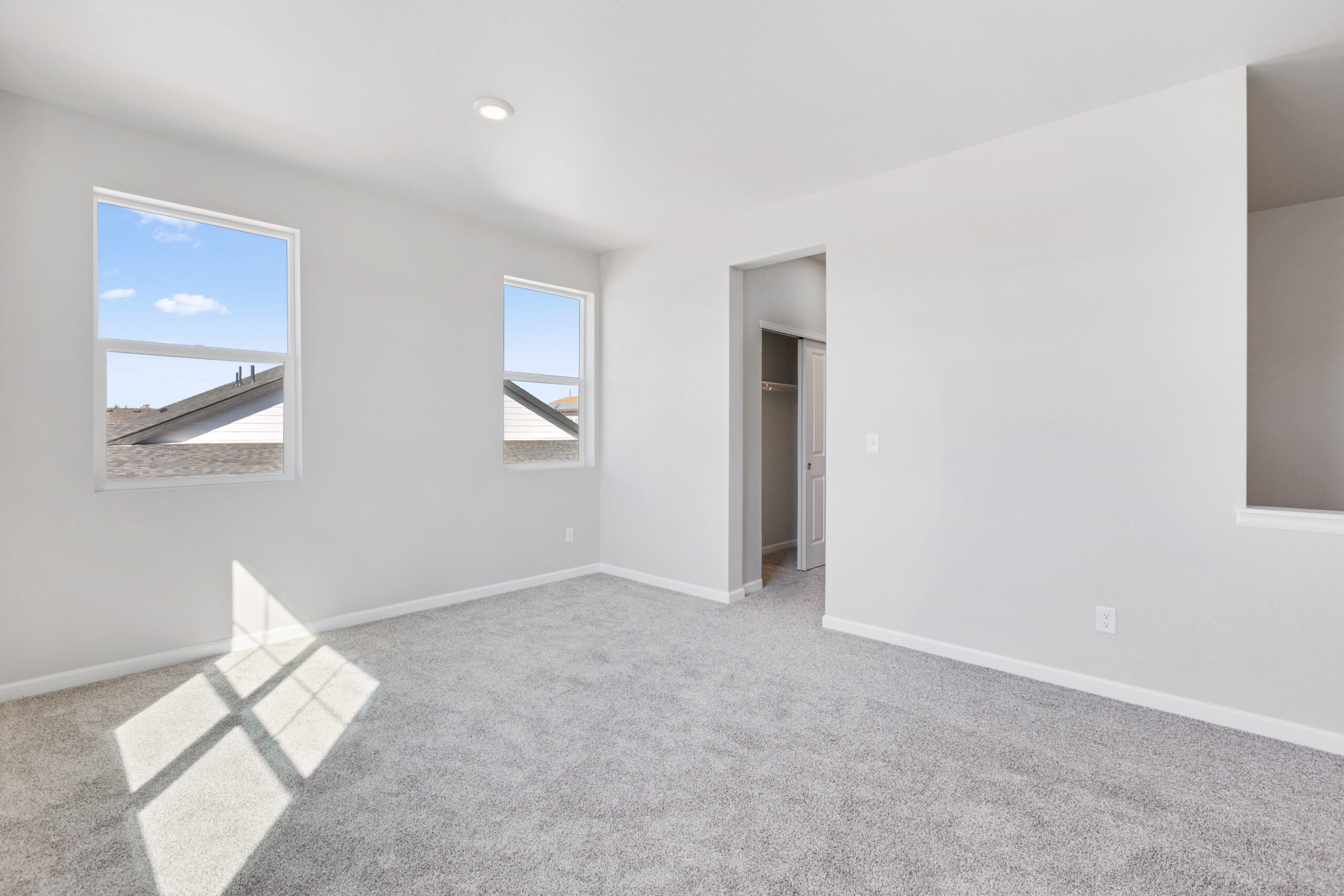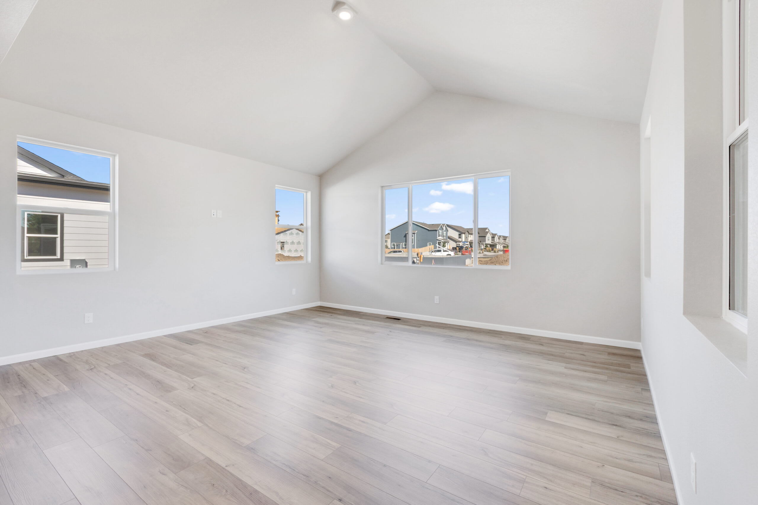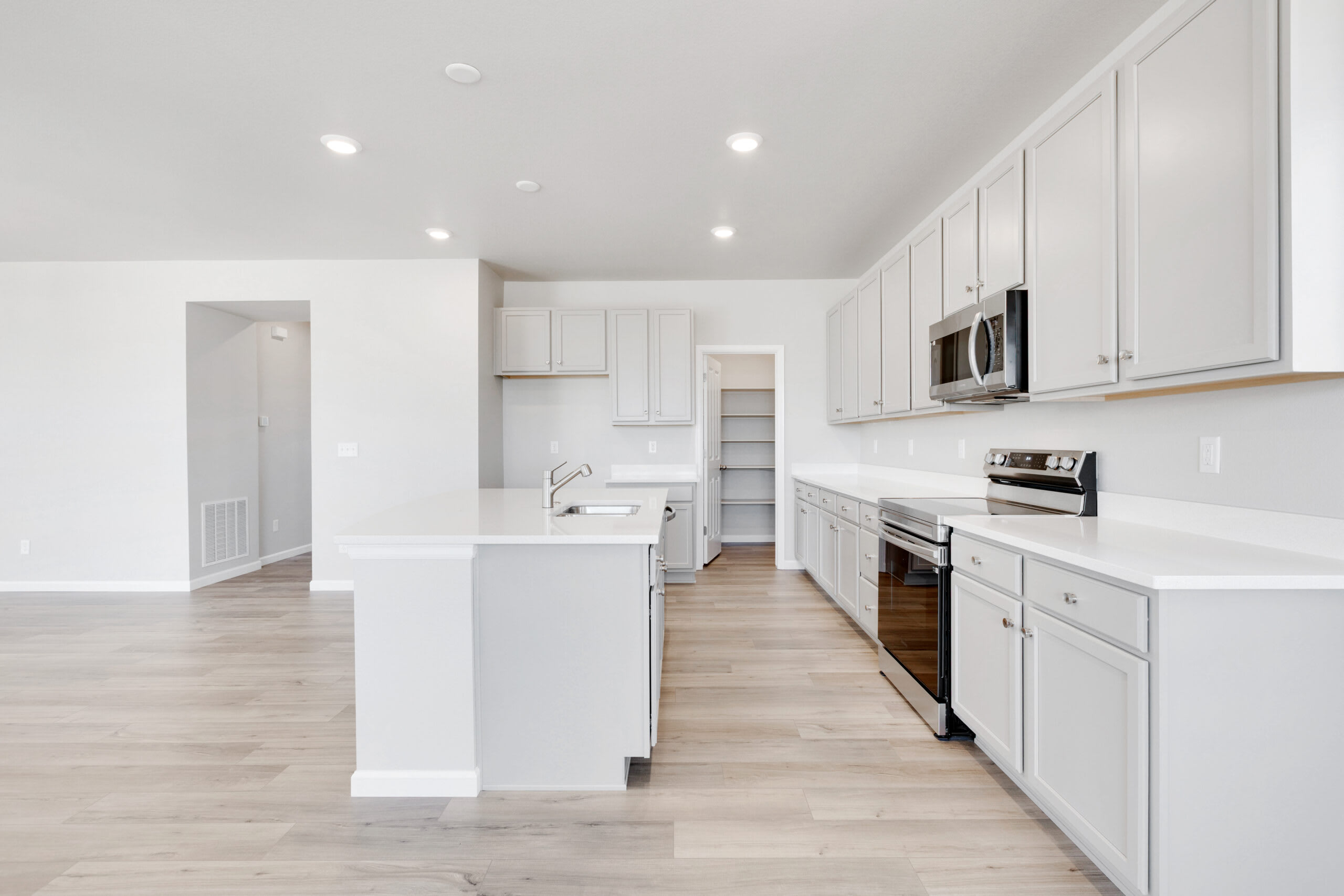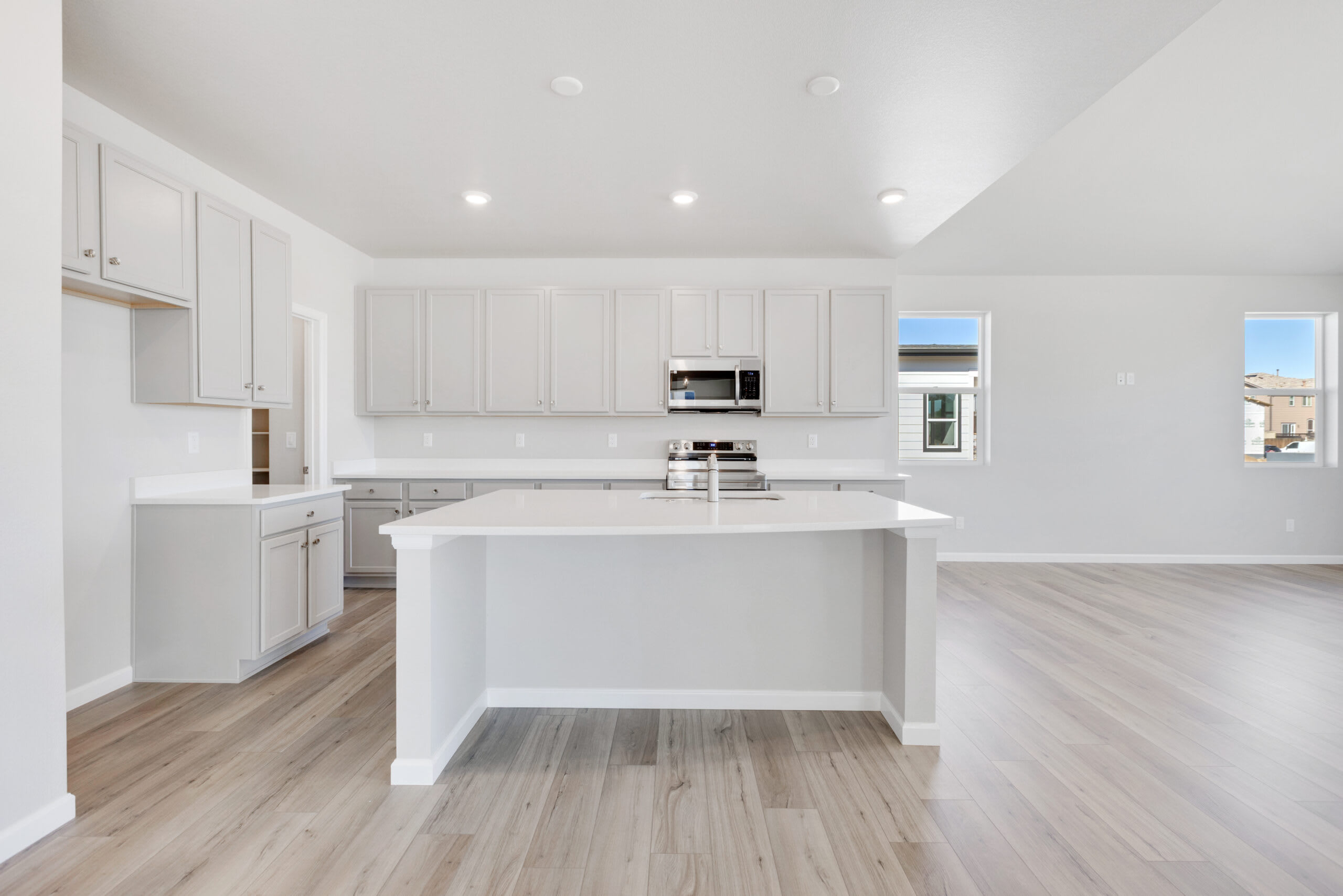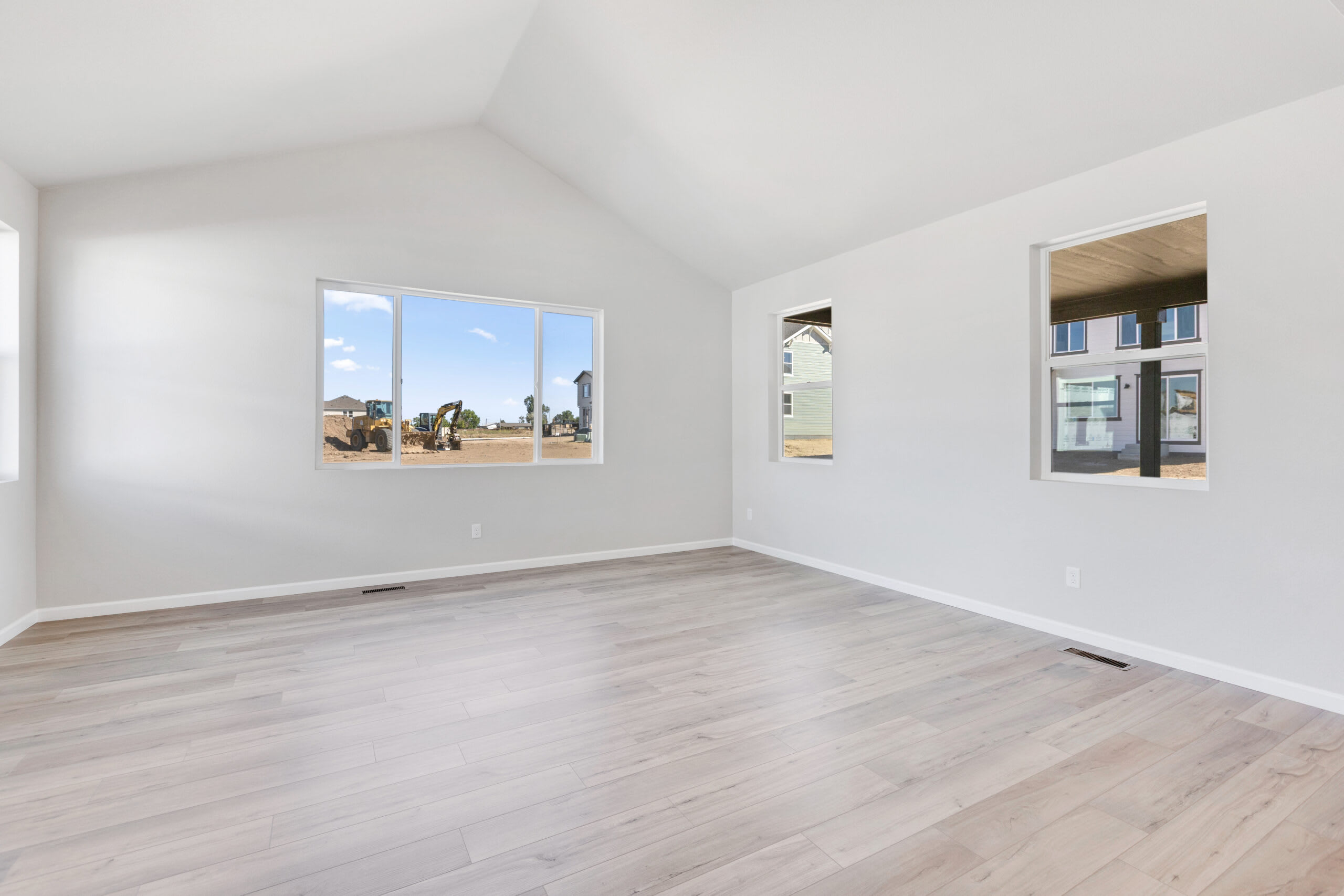 As you walk up the front porch and into the entryway of the home, you’ll have the study to your right and mudroom to your left with a powder bathroom and access into the 3-car garage. At the end of the hallway from the entryway, you’ll be greeted by the open-concept main level where the kitchen, great room, and nook/dining area flow effortlessly between one another. The kitchen features and eat-at center island, a tiled backsplash, and a walk-in pantry. Just beside the nook/dining area, you’ll have a sliding glass door that takes you to the rear covered patio. This would be the ideal space to sip your morning coffee, read a book, entertain guests, or soak in the Colorado sunshine. You’ll have an additional room beside the nook to utilize as flex space. Turn this space into a fitness studio, play room or craft room for the kids, a zen den or place to relax, or a theater room. The ideas are endless!