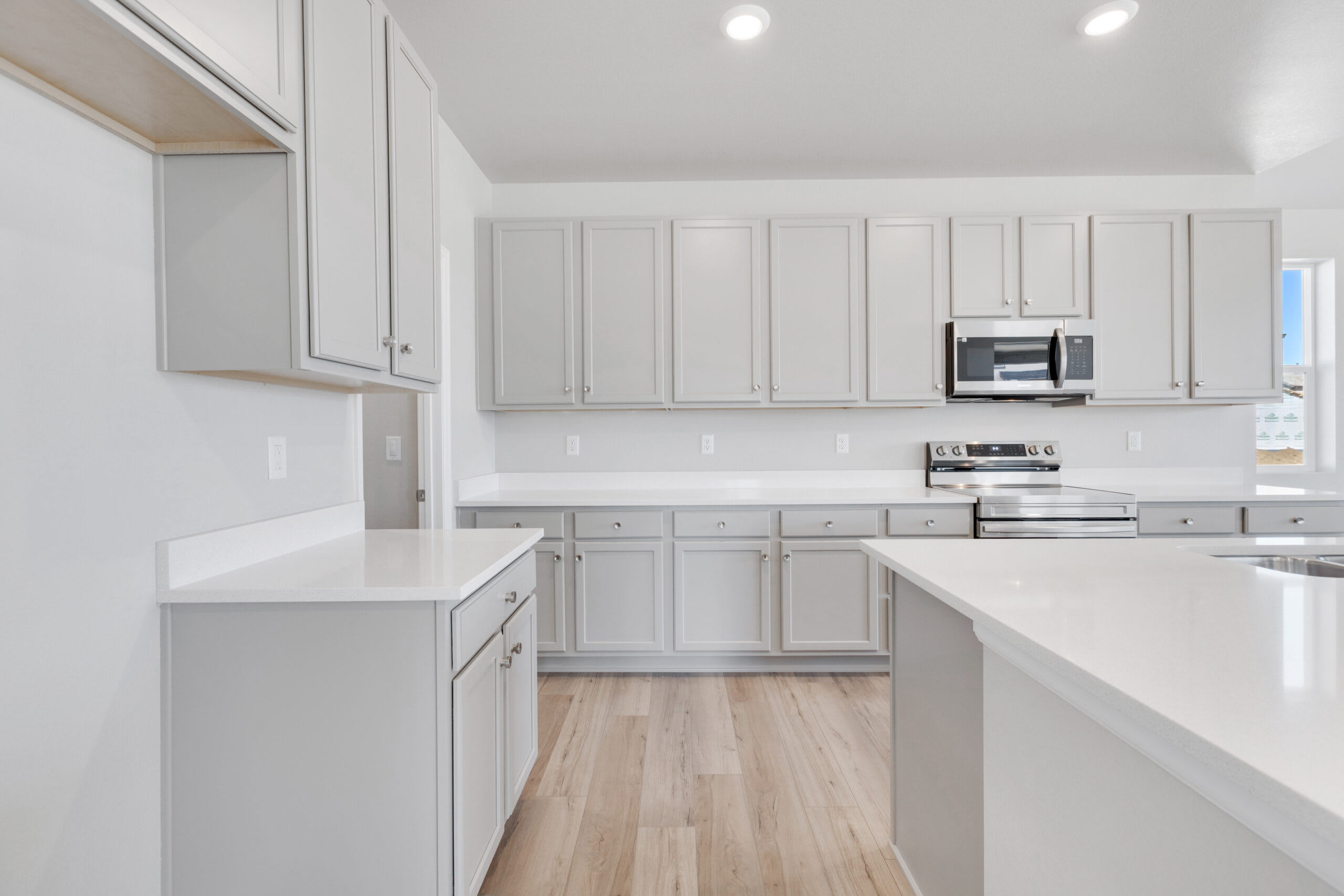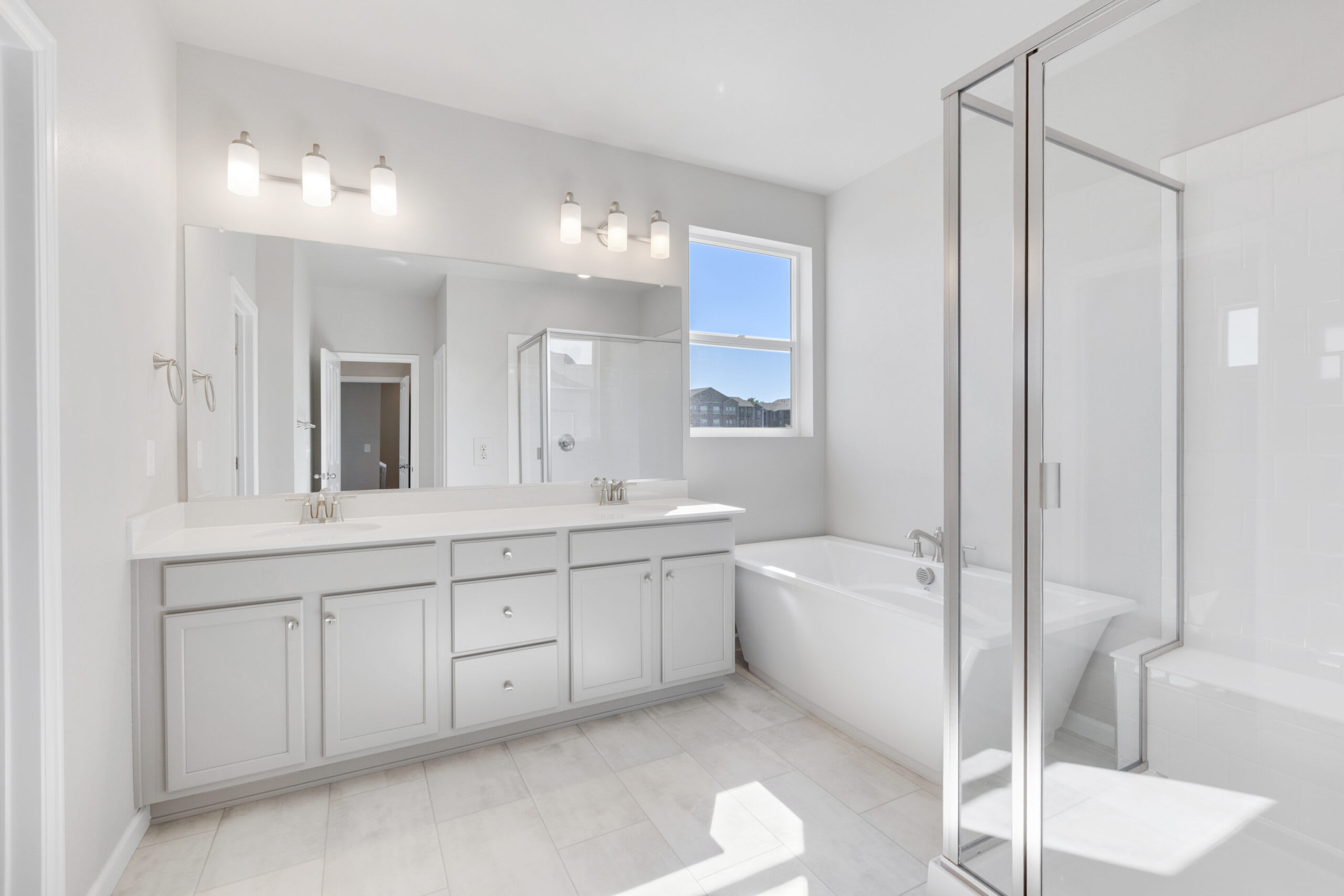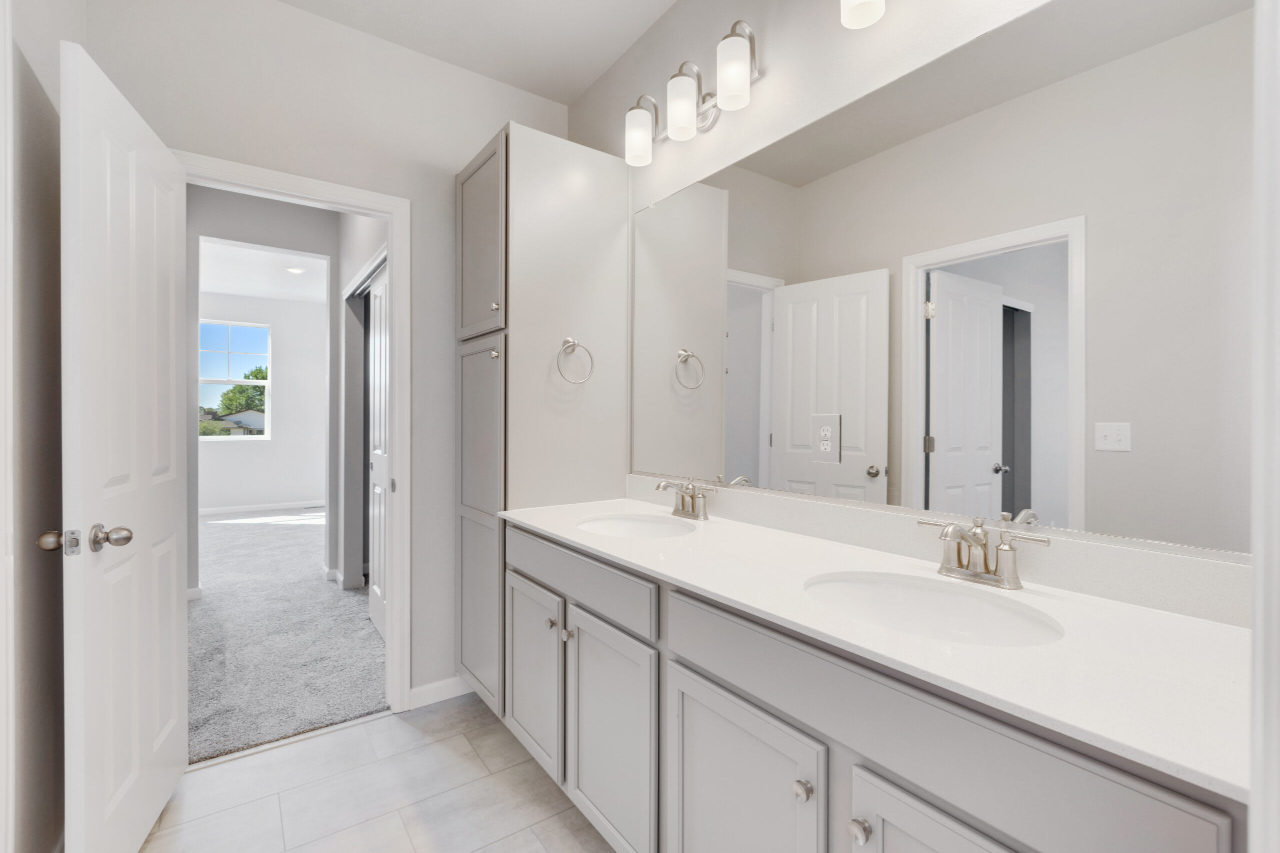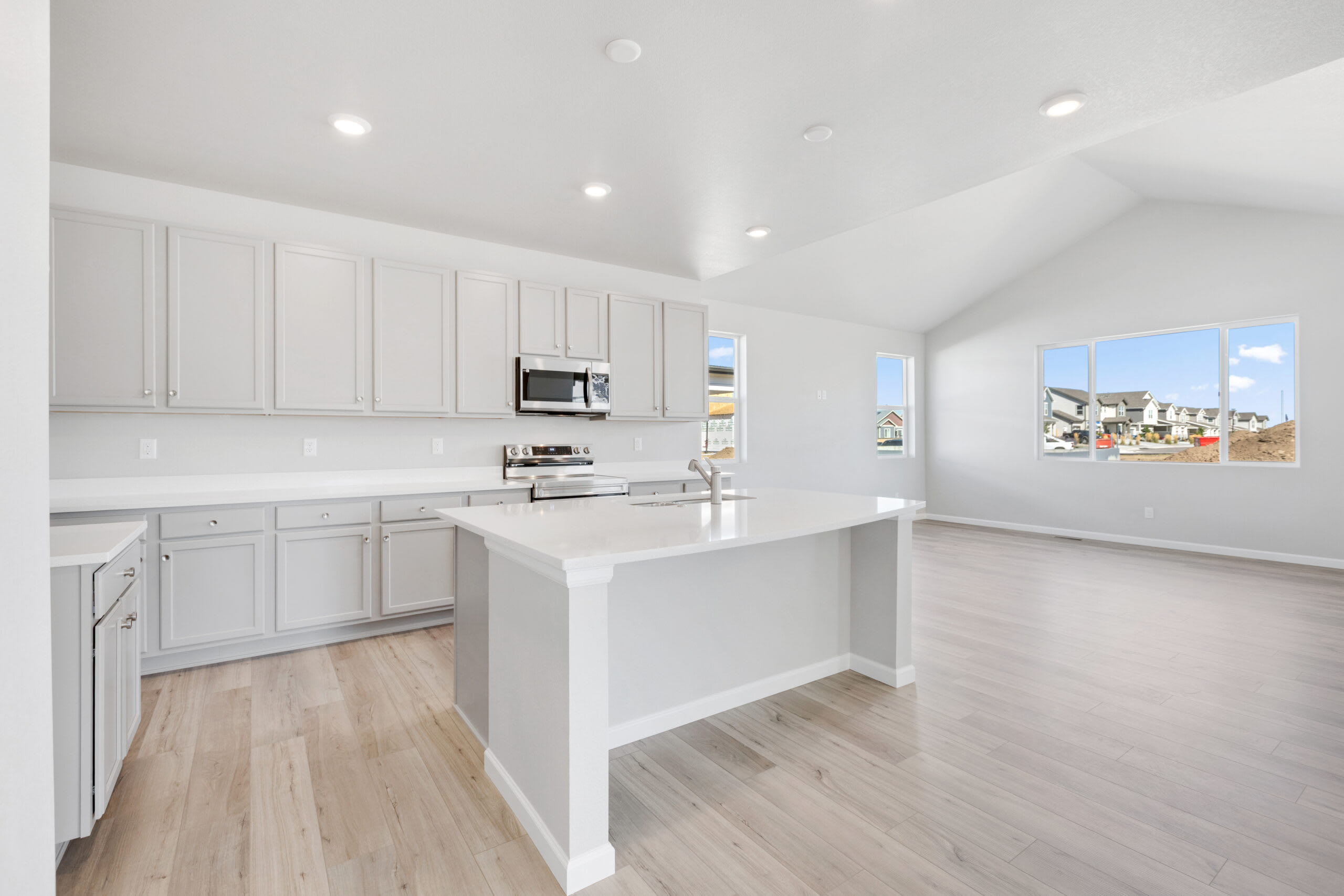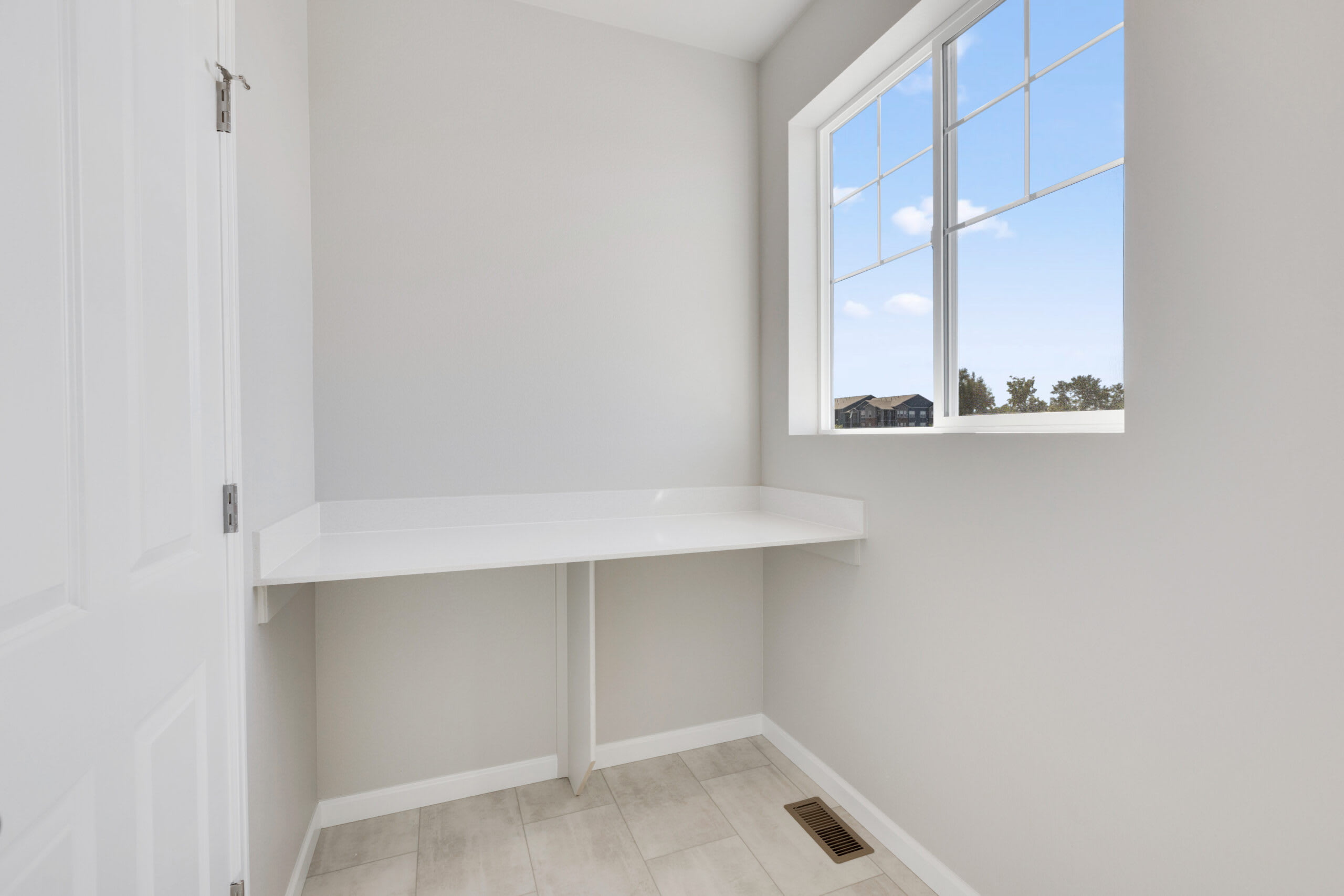 As you walk up the front porch and into the entryway of the home, you’ll have the study to your right and mudroom to your left with a powder bathroom and access into the 3-car garage. At the end of the hallway from the entryway, you’ll be greeted by the open-concept main level where the kitchen, great room, and nook/dining area flow effortlessly between one another. The kitchen features and eat-at center island, a tiled backsplash, and a walk-in pantry. Just beside the nook/dining area, you’ll have a sliding glass door that takes you to the rear covered patio. This would be the ideal space to sip your morning coffee, read a book, entertain guests, or soak in the Colorado sunshine. You’ll have an additional room beside the nook to utilize as flex space. Turn this space into a fitness studio, play room or craft room for the kids, a zen den or place to relax, or a theater room. The ideas are endless!