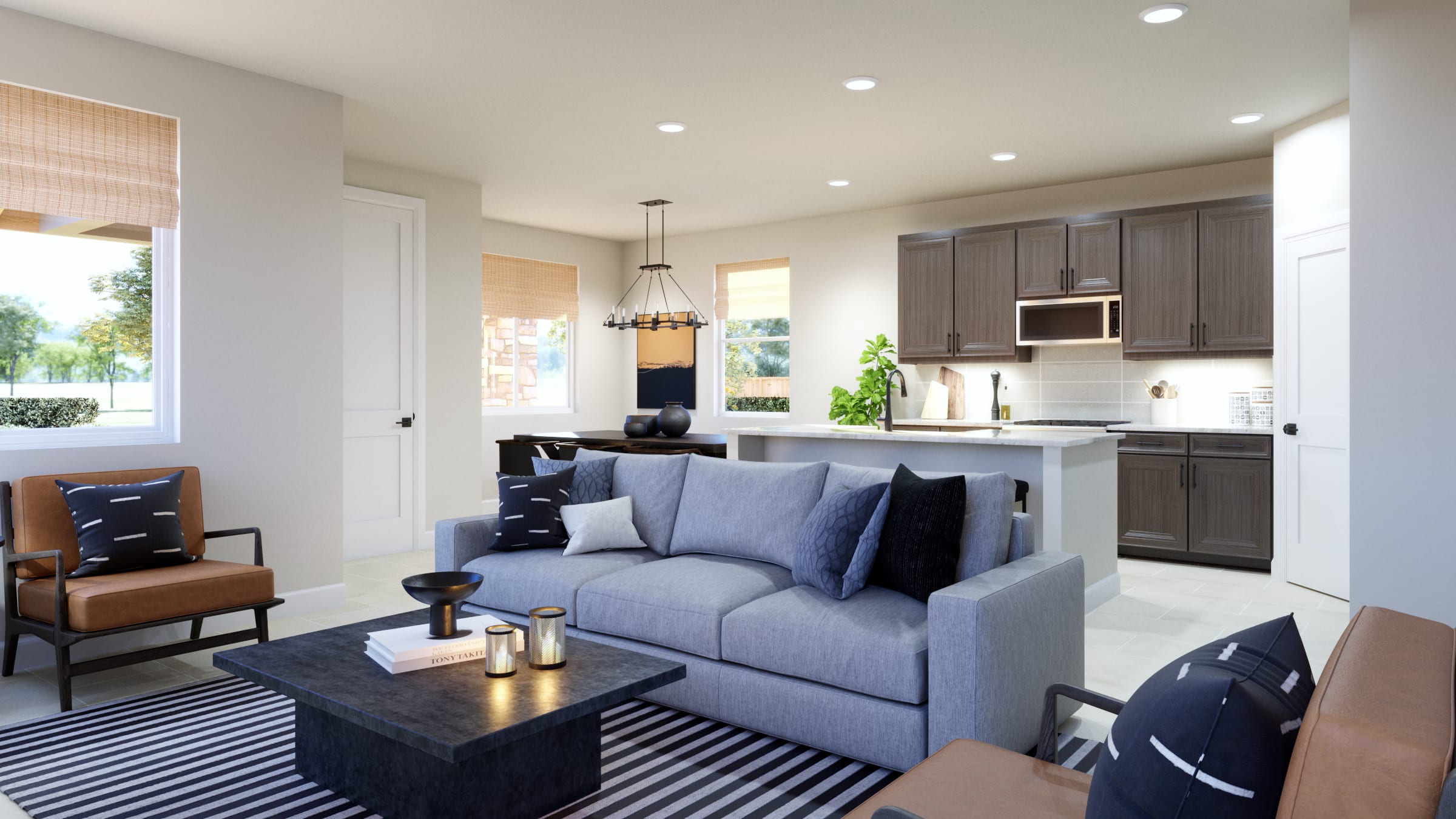 As you walk past the front porch and into the entryway of the home, you’re greeted by the open concept main living area. The dining area, kitchen, and great room flow effortlessly between one another which is perfect for entertaining guests or keeping an eye on little ones while you’re cooking. The L-shaped kitchen features a large center island, pantry. and tiled backsplash. At the back of the home, you’ll have a coat closet as you enter from the 2-car garage and a powder bath.