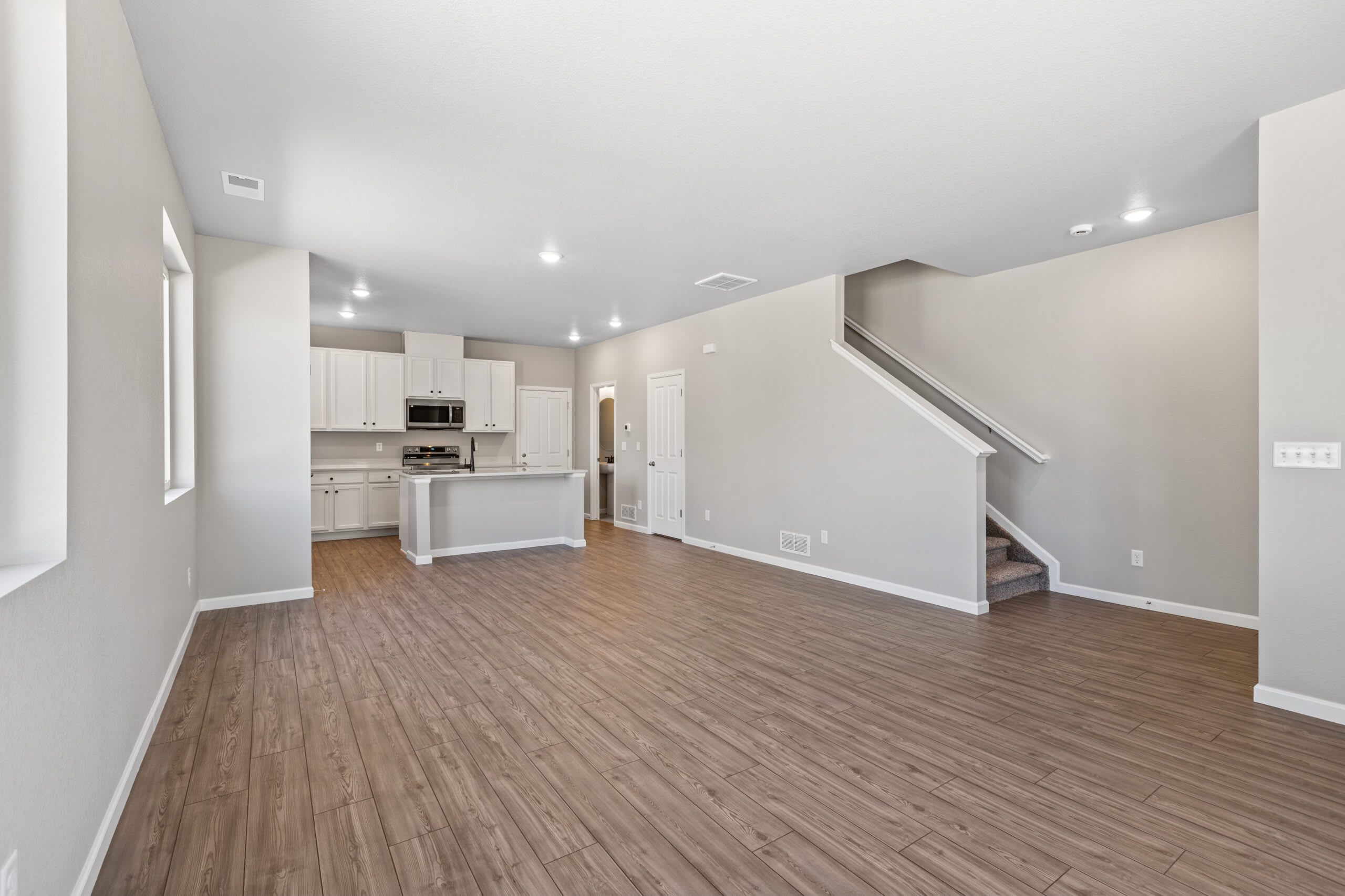 When you walk to the front door of the home, you’ll pass the porch, which is perfect for your morning coffee, cozying up with a good book, or just soaking up the sunshine in the summer months. As you walk through the front door, you’ll find the stairs to the upper level in front of you and the open-concept main level to your left. The great room, dining area, and kitchen flow effortlessly which is ideal for entertaining guests. The kitchen features a large eat-at center island, pantry, and tiled backsplash. At the back of the home, you’ll find the door to the 2-car garage, a powder room, and a closet under the staircase for additional storage.