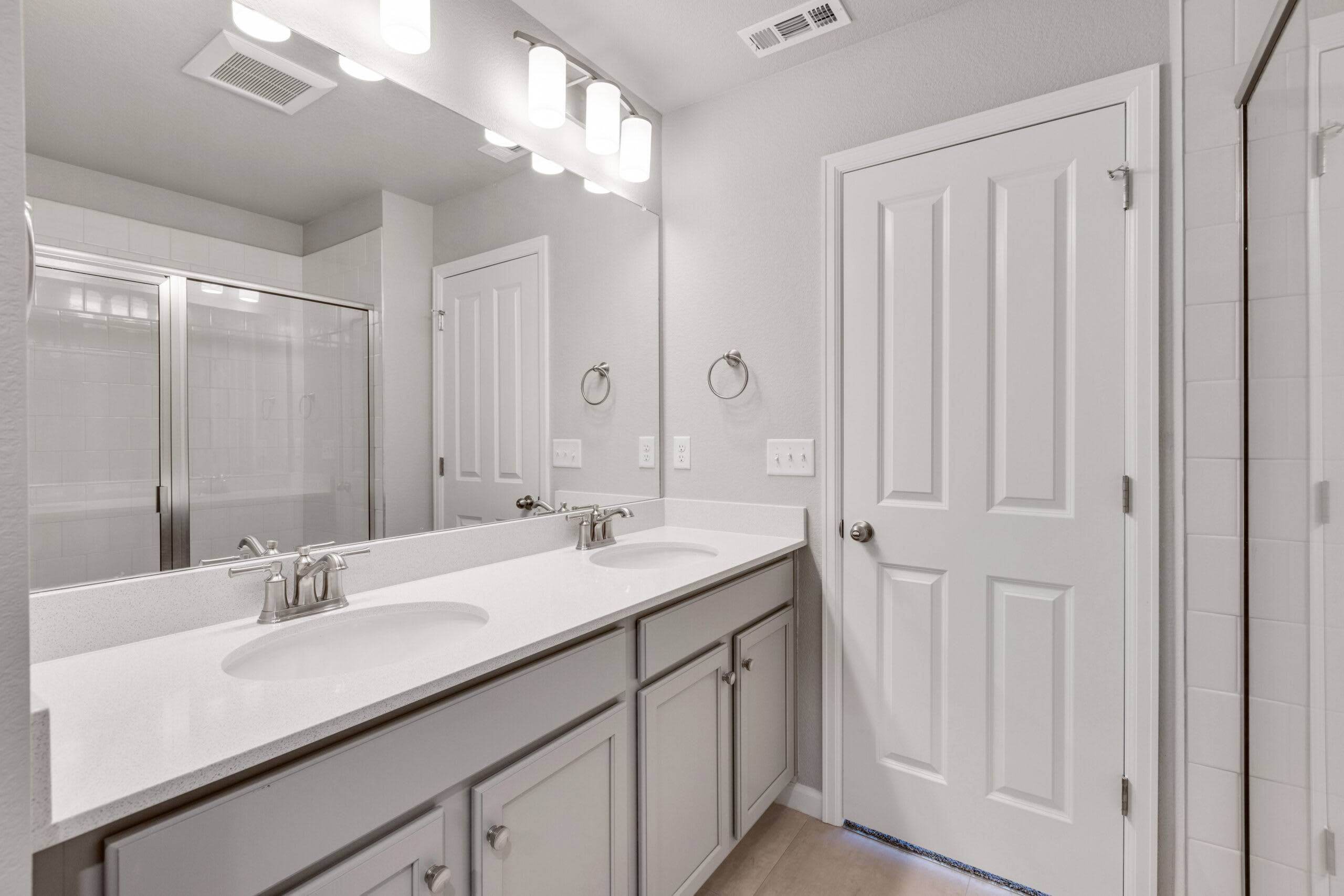 Heading to the front of the home and up the stairs to the second level, you’ll find a laundry room centralized to the upper level. The primary bedroom is positioned at the front of the home featuring a private bathroom with a double sink vanity, tiled shower, linen closet, and a walk-in closet. As you walk down the upper-level hallway to the back of the home, you’ll find the second bedroom which also has its own private full bathroom.