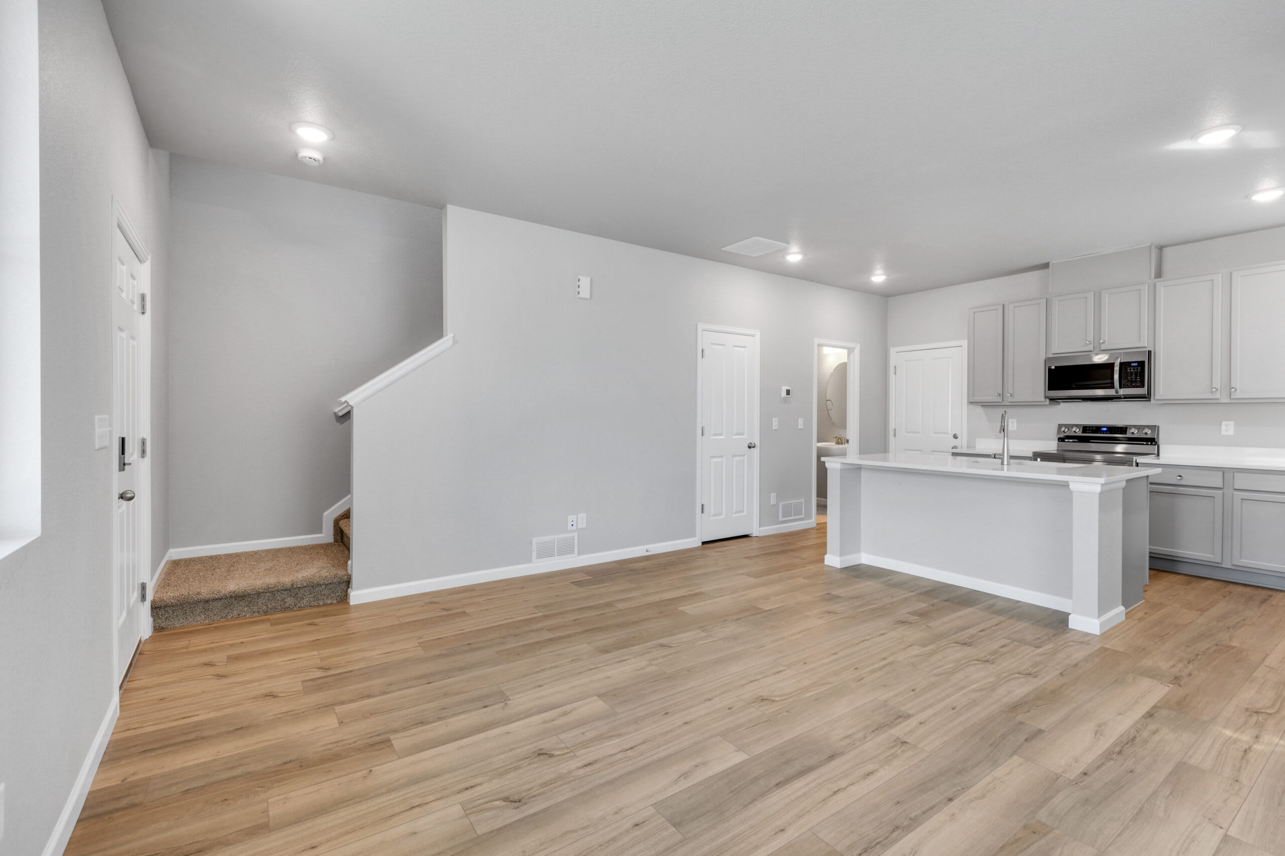 When you walk up to the front door of the home, you’ll pass the spacious porch, which is perfect for your morning coffee, cozying up with a good book, or just soaking up the sunshine in the summer months. As you walk through the front door, you’re greeted by the great room which flows effortlessly into the L-shaped kitchen with an eat-at center island. At the back of the home, you’ll find a closet under the staircase for additional storage, a powder room, and a door leading to the 2-car garage.