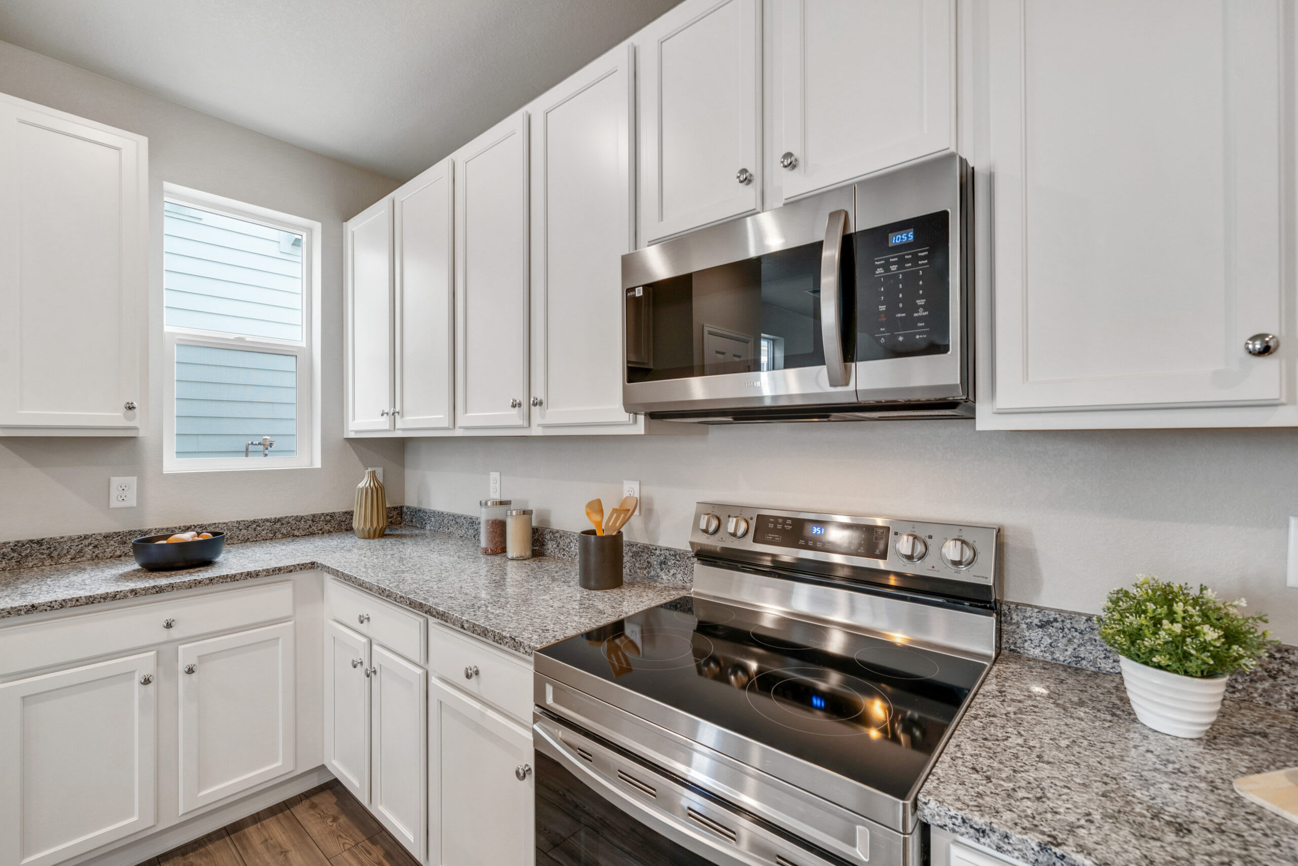 When you walk to the front door of the home, you’ll pass the porch, which is perfect for your morning coffee, cozying up with a good book, or just soaking up the sunshine in the summer months. As you walk through the front door, you’ll find the stairs to the upper level in front of you and the open-concept main level to your left. The great room, dining area, and kitchen flow effortlessly which is ideal for entertaining guests. The kitchen features a large center island, a pantry, and quartz or granite countertops. At the back of the home, you’ll find the door to the garage, a powder room, and a closet under the staircase for additional storage.