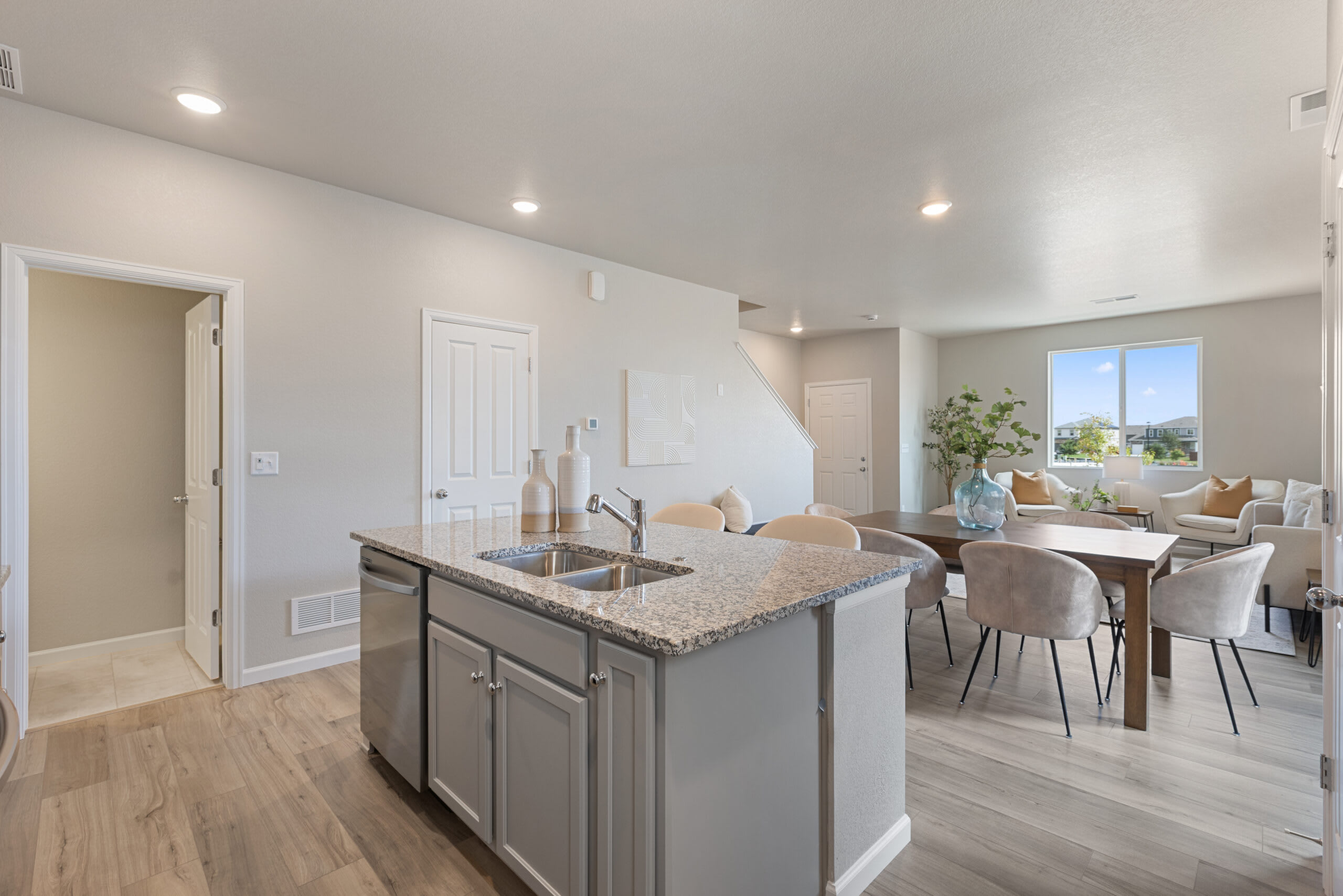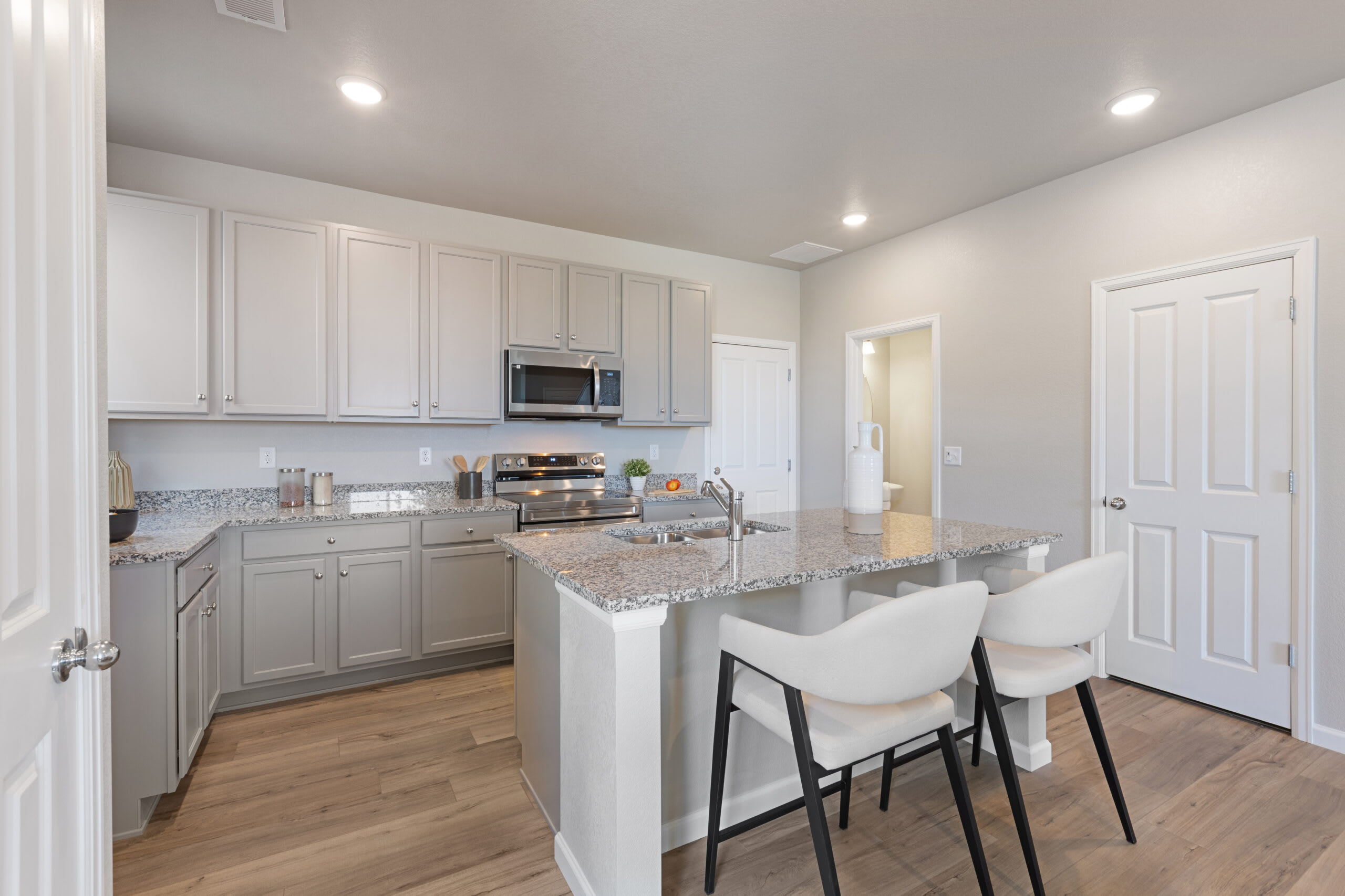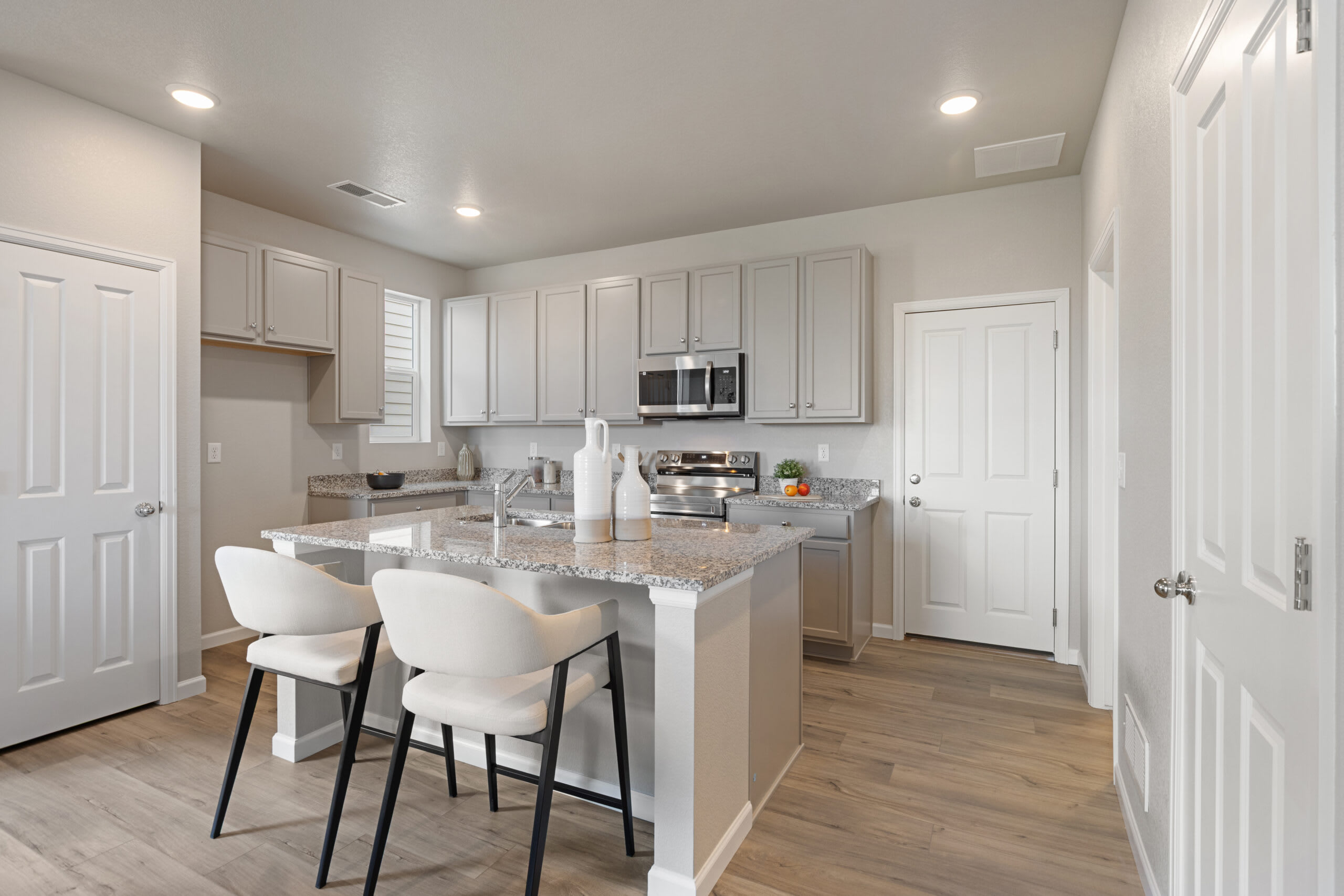 When you walk to the front door of the home, you’ll pass the porch, which is perfect for your morning coffee, cozying up with a good book, or just soaking up the sunshine in the summer months. As you walk through the front door, you’ll find the stairs to the upper level in front of you and the open-concept main level to your left. The great room, dining area, and kitchen flow effortlessly which is ideal for entertaining guests. The kitchen features a large center island and a pantry. At the back of the home, you’ll find the door to the garage, a powder room, and a closet under the staircase for additional storage.