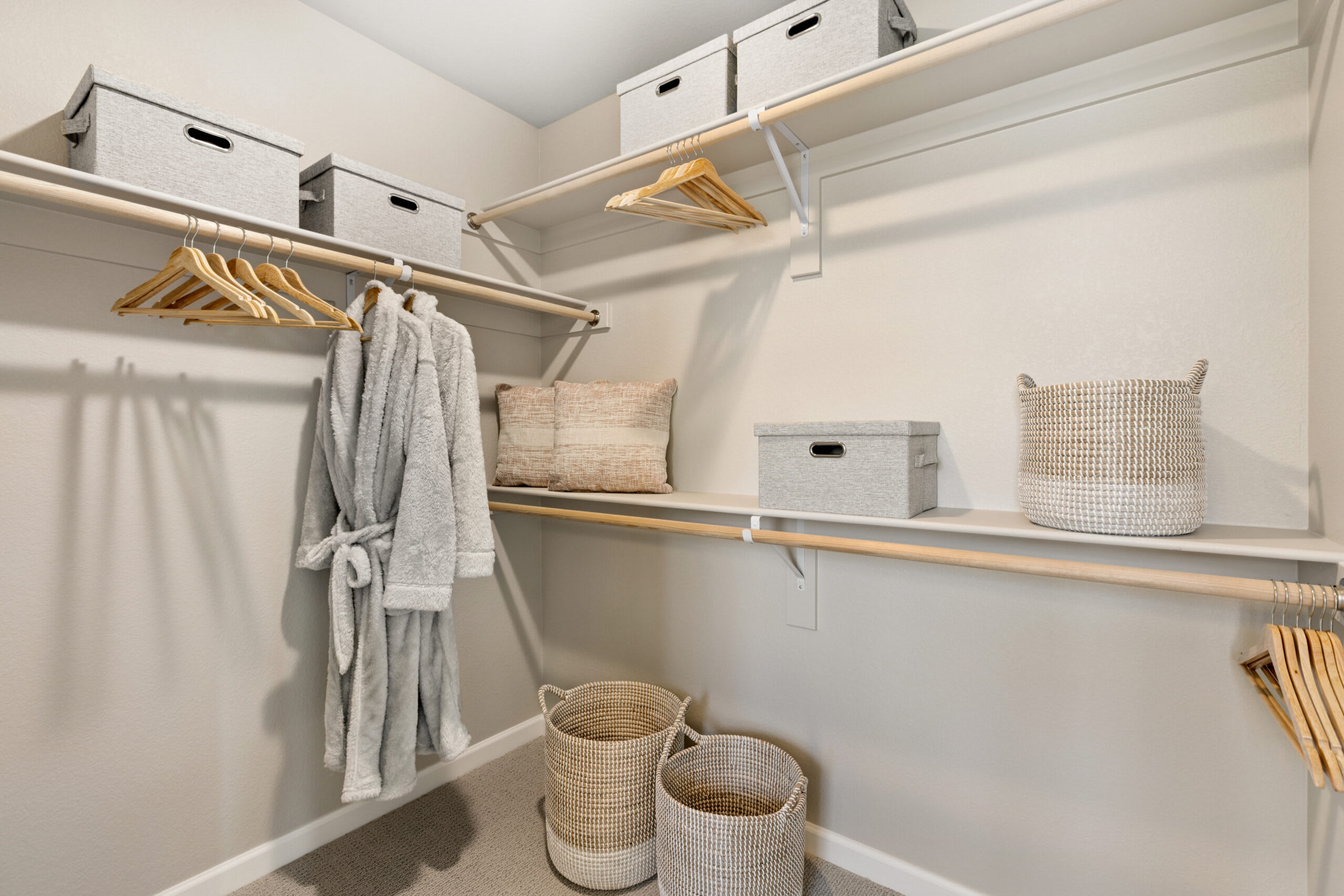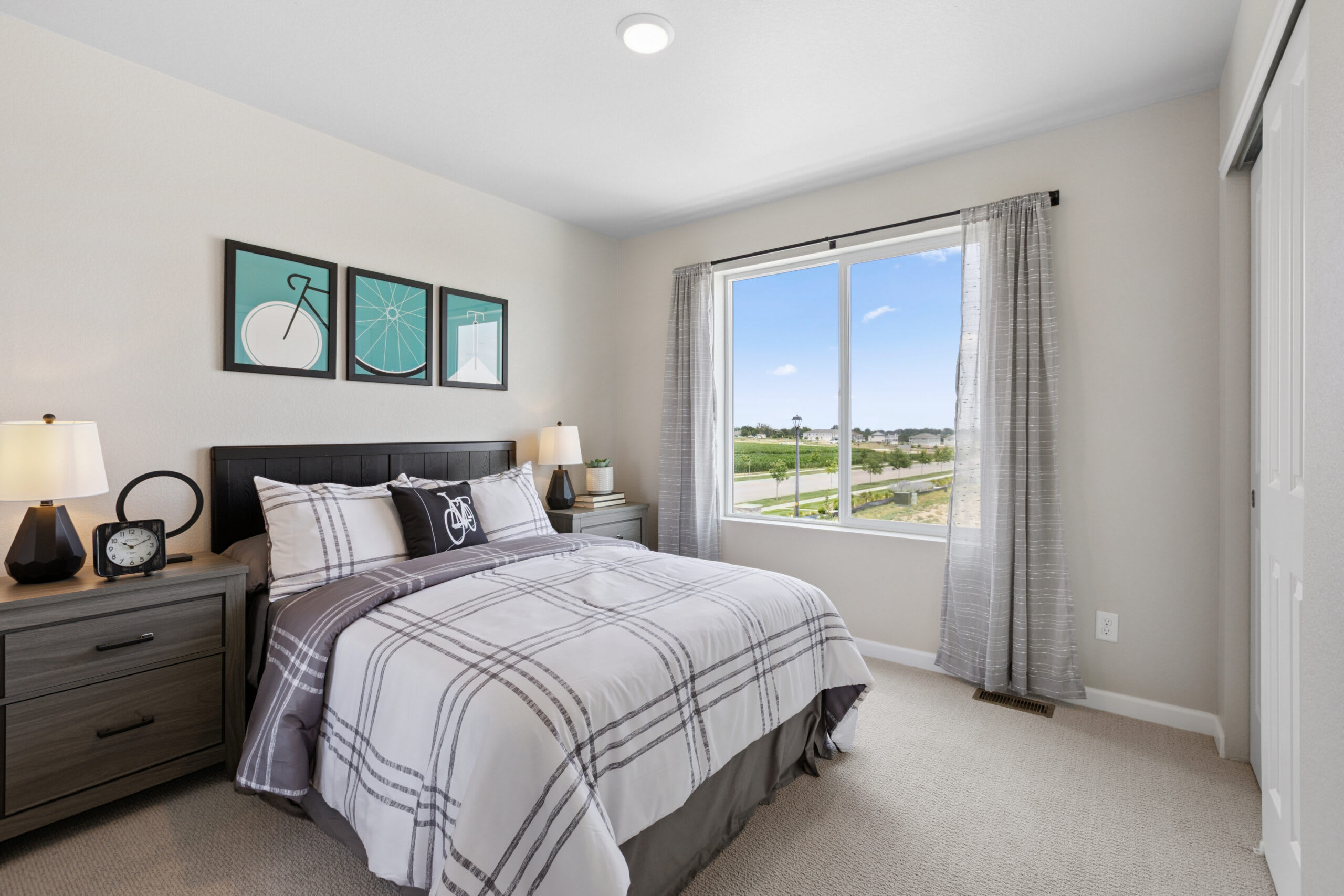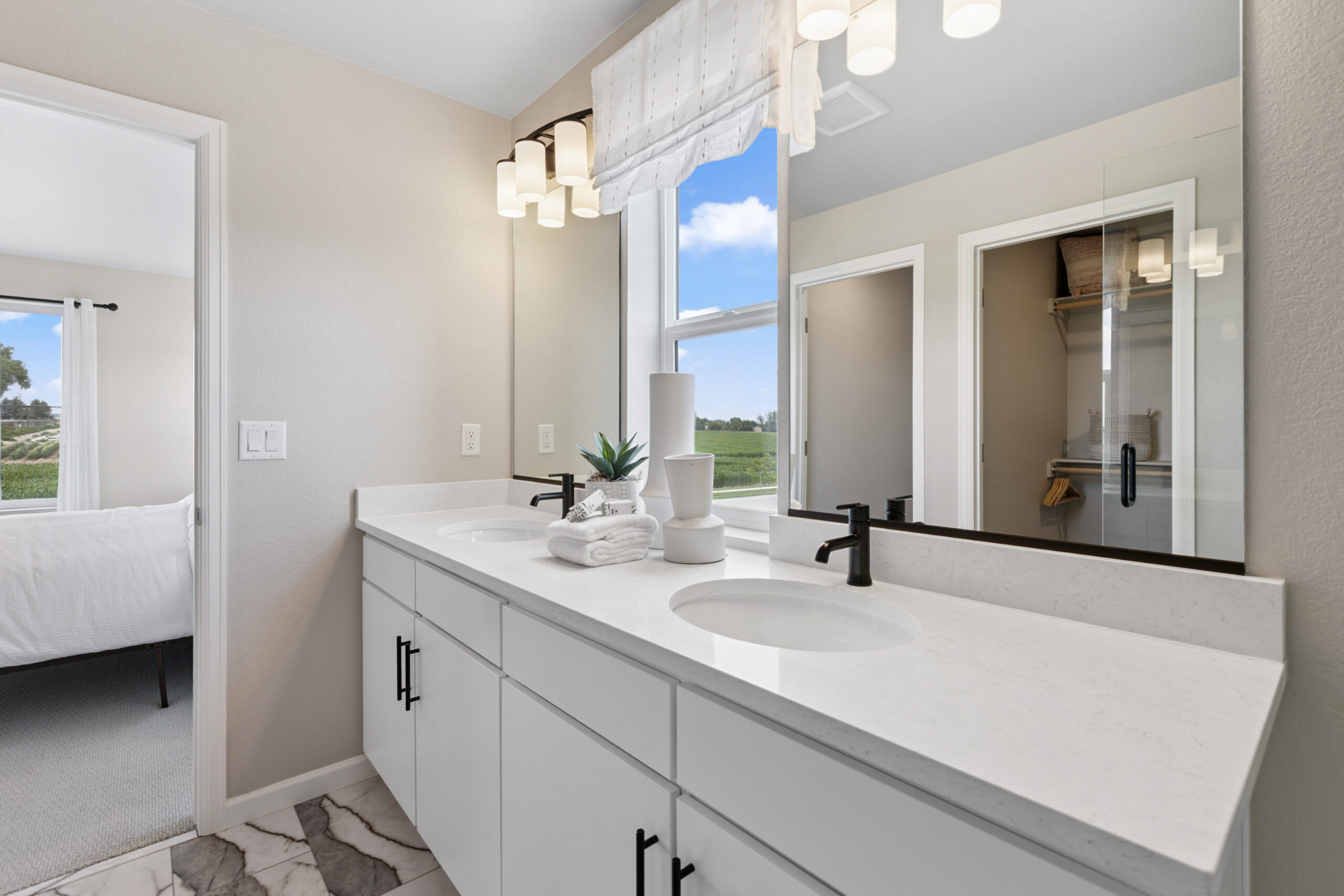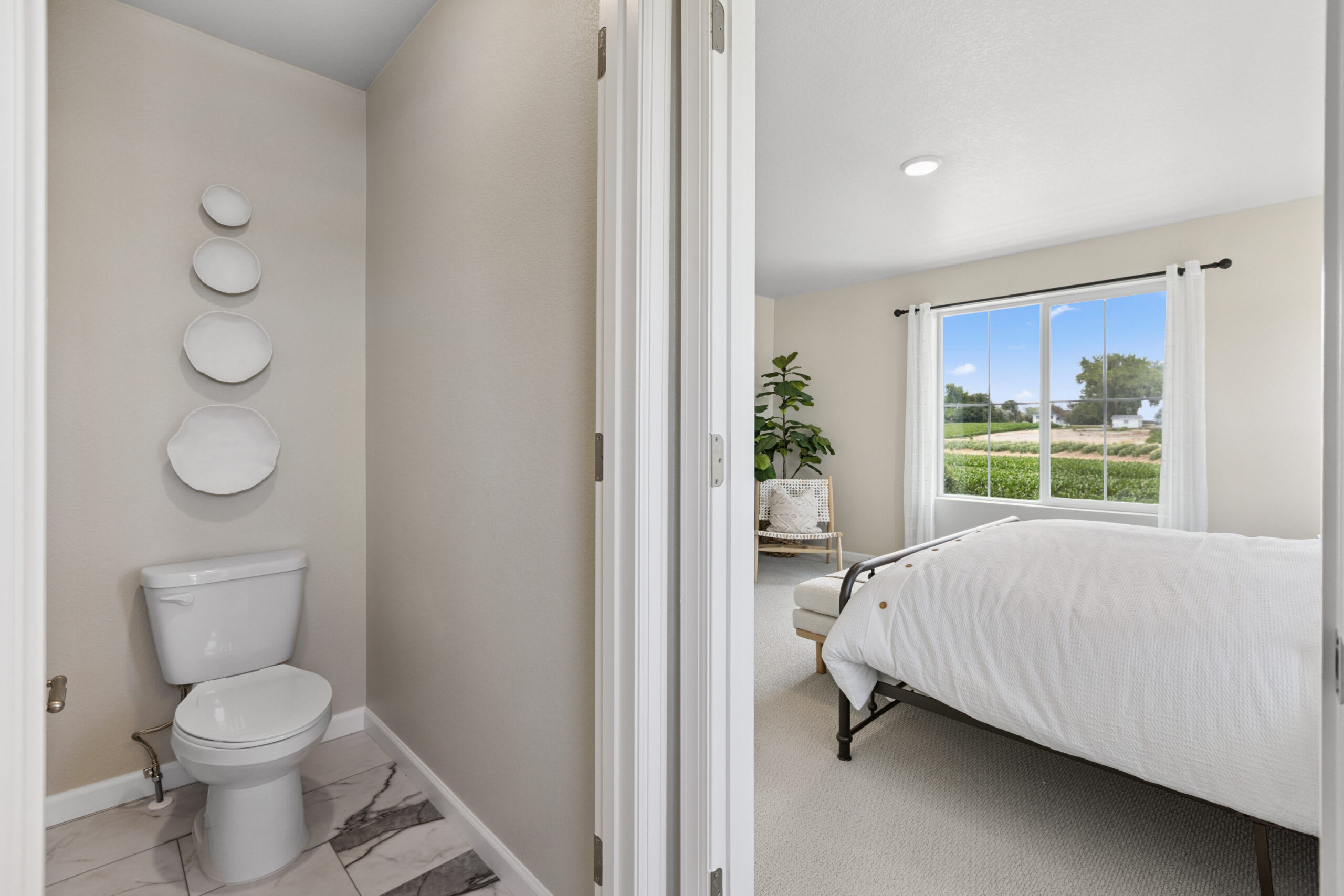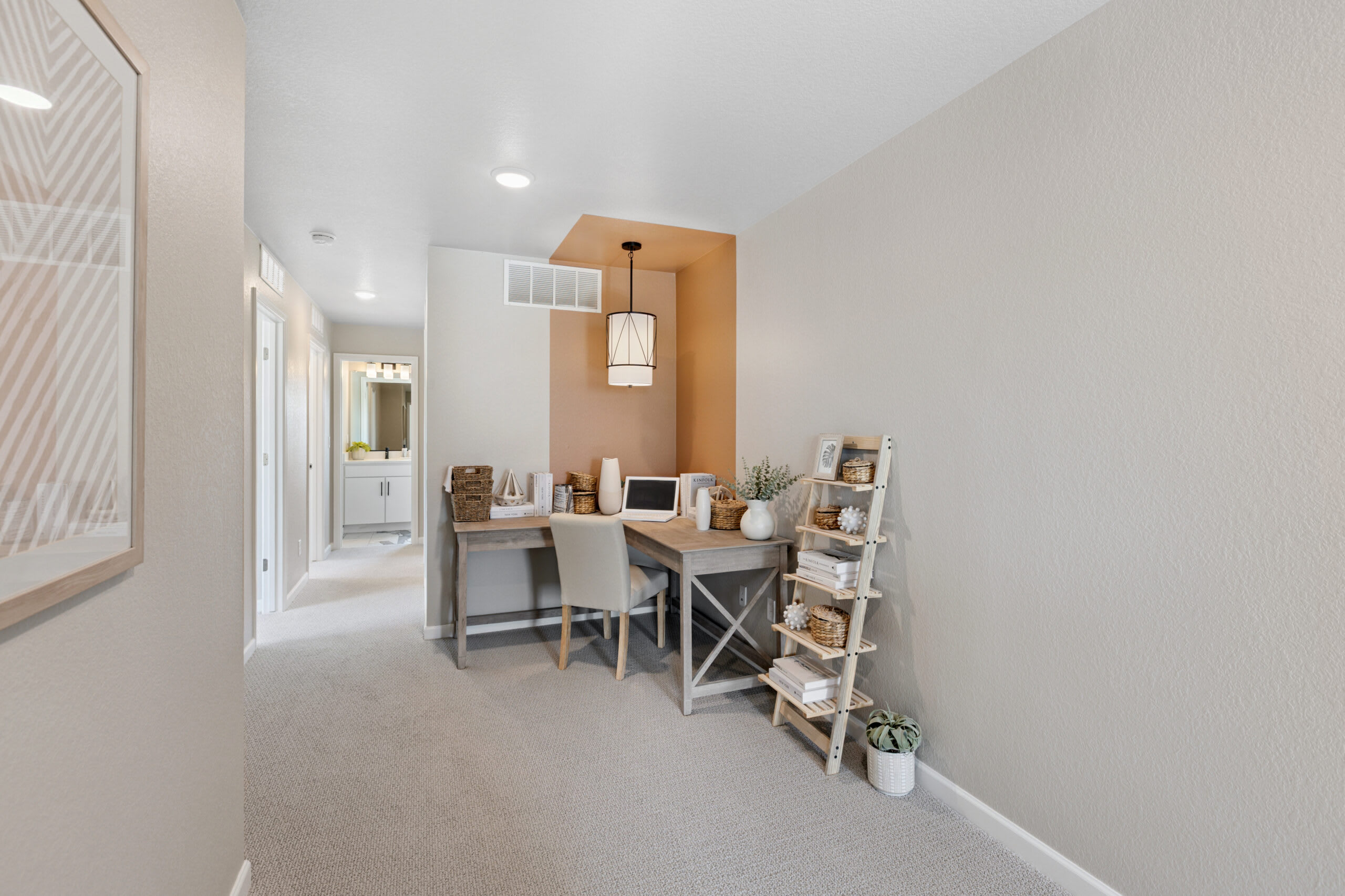To the right of the entryway, you’ll head up the L-shaped staircase and find an open space for a small home office, homework or play area for the kids, or any additional flex space your family needs. The Biscayne floorplan offers the option to turn this space into a pocket office with an additional closet for storage. The primary bedroom is positioned at the front of the home with a private bathroom with a double vanity, water closet, and walk-in closet. At the other end of the upper-level hallway, you’ll find a laundry room, a second full bathroom, and the second and third bedroom.