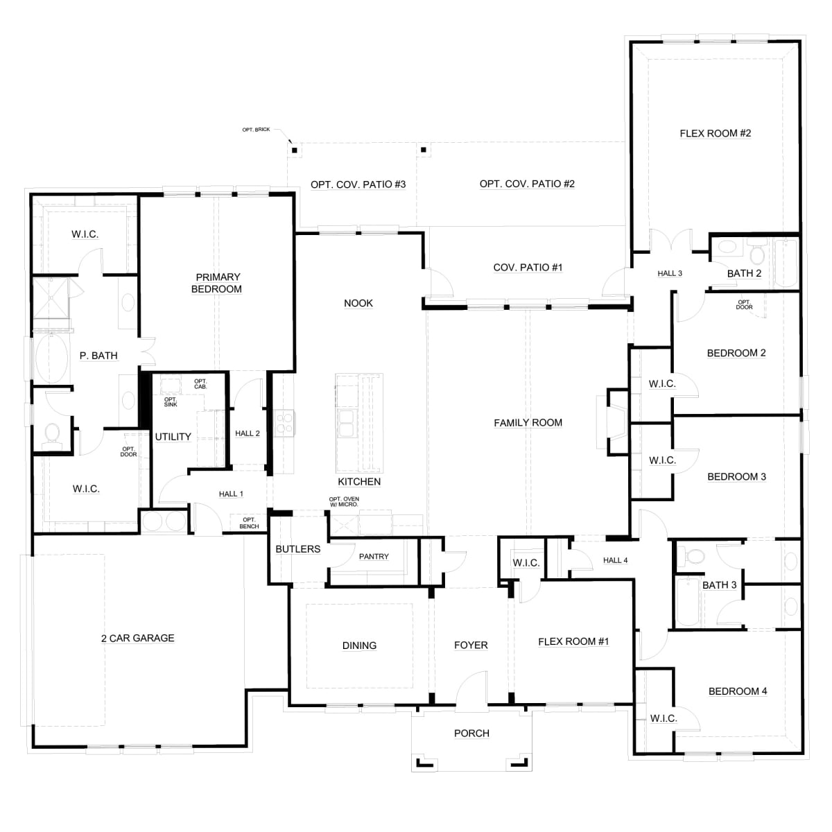 This spacious single-story home features a thoughtfully designed layout including 4 bedrooms, 3 bathrooms, a study, and multiple flexible living spaces. At the heart of the home, the open-concept kitchen includes a large island, walk-in pantry, butler’s pantry, and direct access to the dining room and family room. The adjoining nook and covered patio with fireplace provide excellent space for casual dining and entertaining. The family room is centrally located and filled with natural light, creating a welcoming gathering space. The primary suite is privately situated with a luxurious bath, soaking tub, separate shower, dual vanities, and a large walk-in closet. Three secondary bedrooms each include walk-in closets and are paired with two full bathrooms for convenience. A flex room offers additional space that can be used as a playroom, media room, or home office. At the front of the home, a dedicated study and elegant dining room provide formal living options. The home also features a spacious utility room and a 3-car garage. This floor plan balances functionality and comfort with open gathering areas, private retreats, and ample storage throughout.