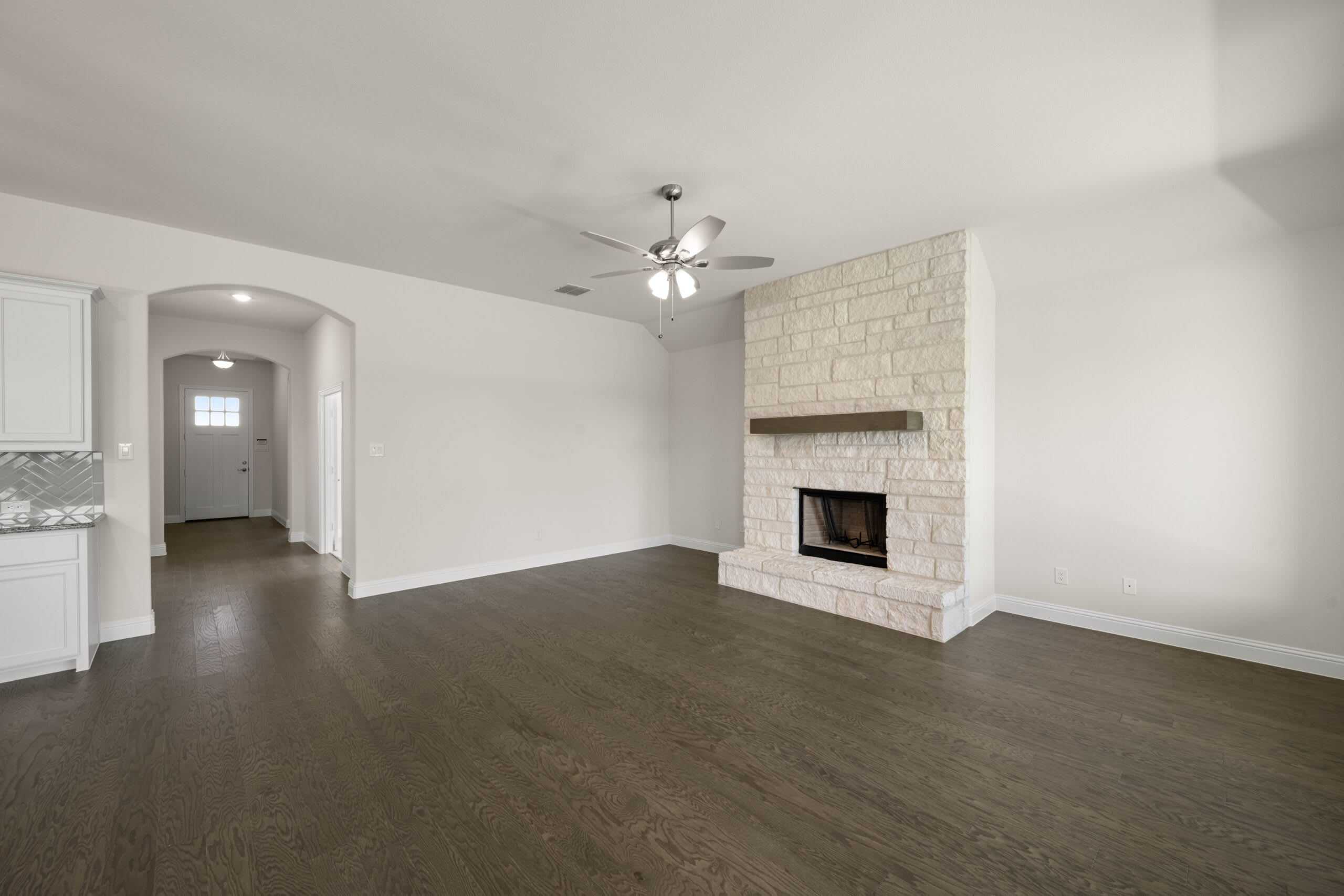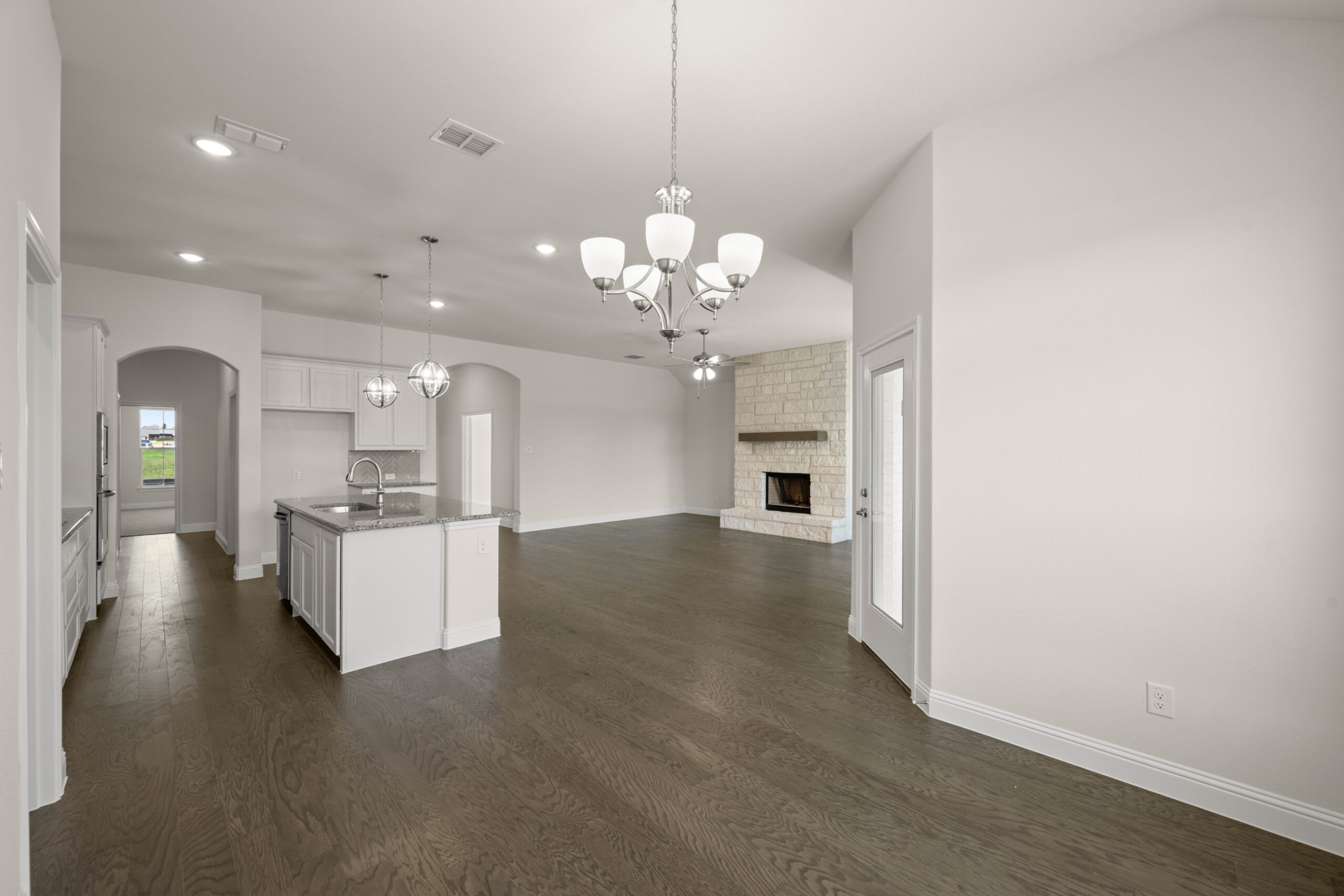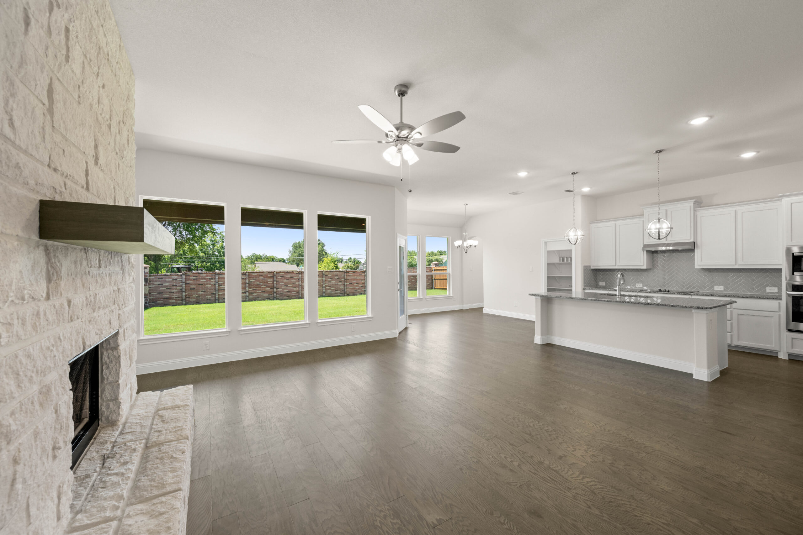 This beautifully designed, single-story home offers a perfect blend of comfort and style, featuring four bedrooms, three bathrooms, and an open-concept layout ideal for modern living. The heart of the home is the spacious family room, where a striking floor-to-ceiling stone fireplace creates a warm and inviting atmosphere. The gourmet kitchen boasts a large island, ample cabinetry, and a walk-in pantry, seamlessly connecting to the bright breakfast nook. The luxurious primary suite offers a spa-like bathroom with dual vanities, a soaking tub, and an expansive walk-in closet. Additional highlights include a private study, a well-appointed utility room, and a covered patio for outdoor relaxation. With thoughtful design and elegant finishes throughout, this home is perfect for those seeking both functionality and sophistication.