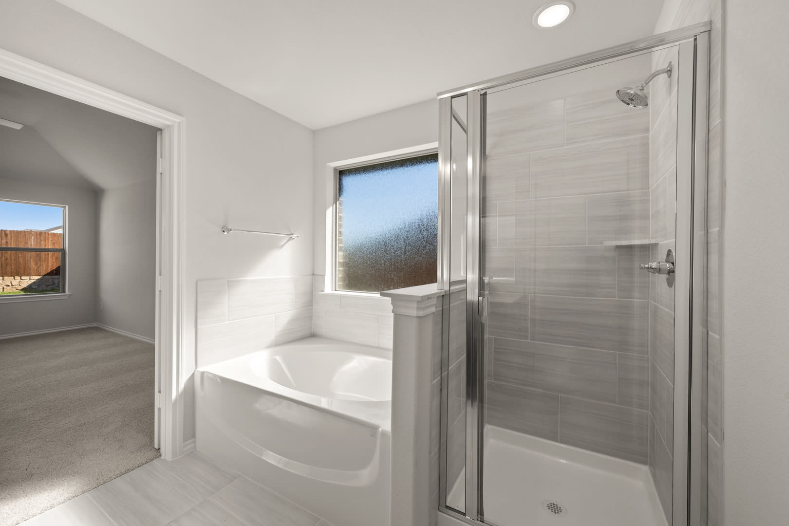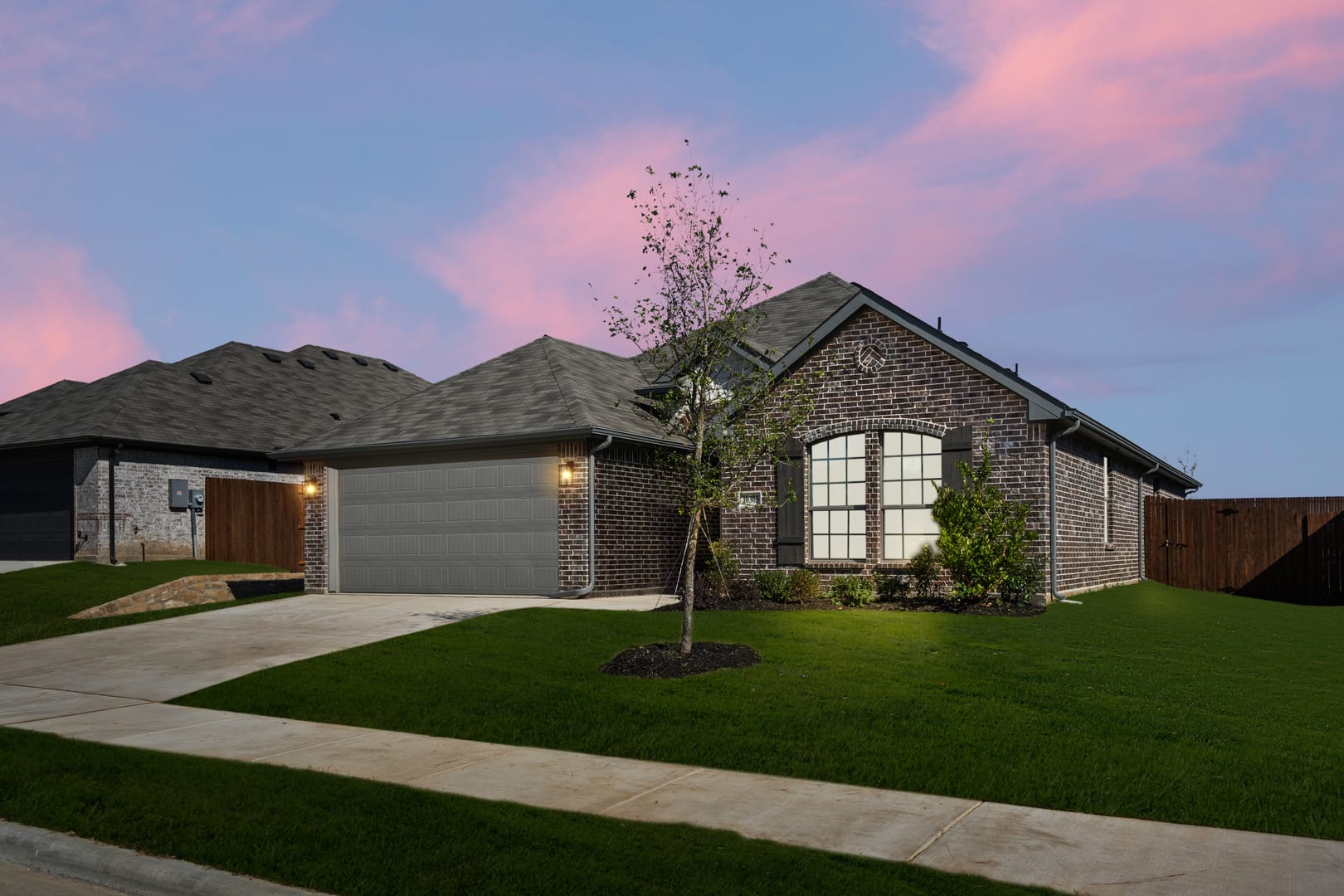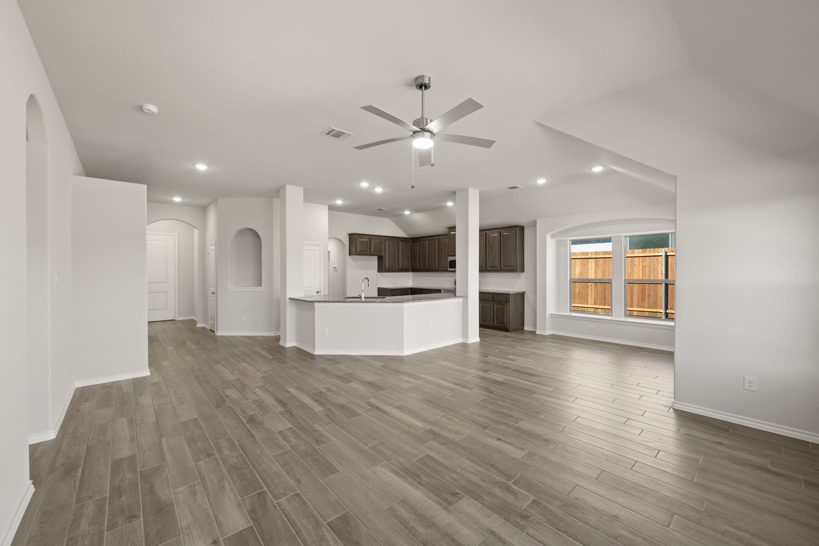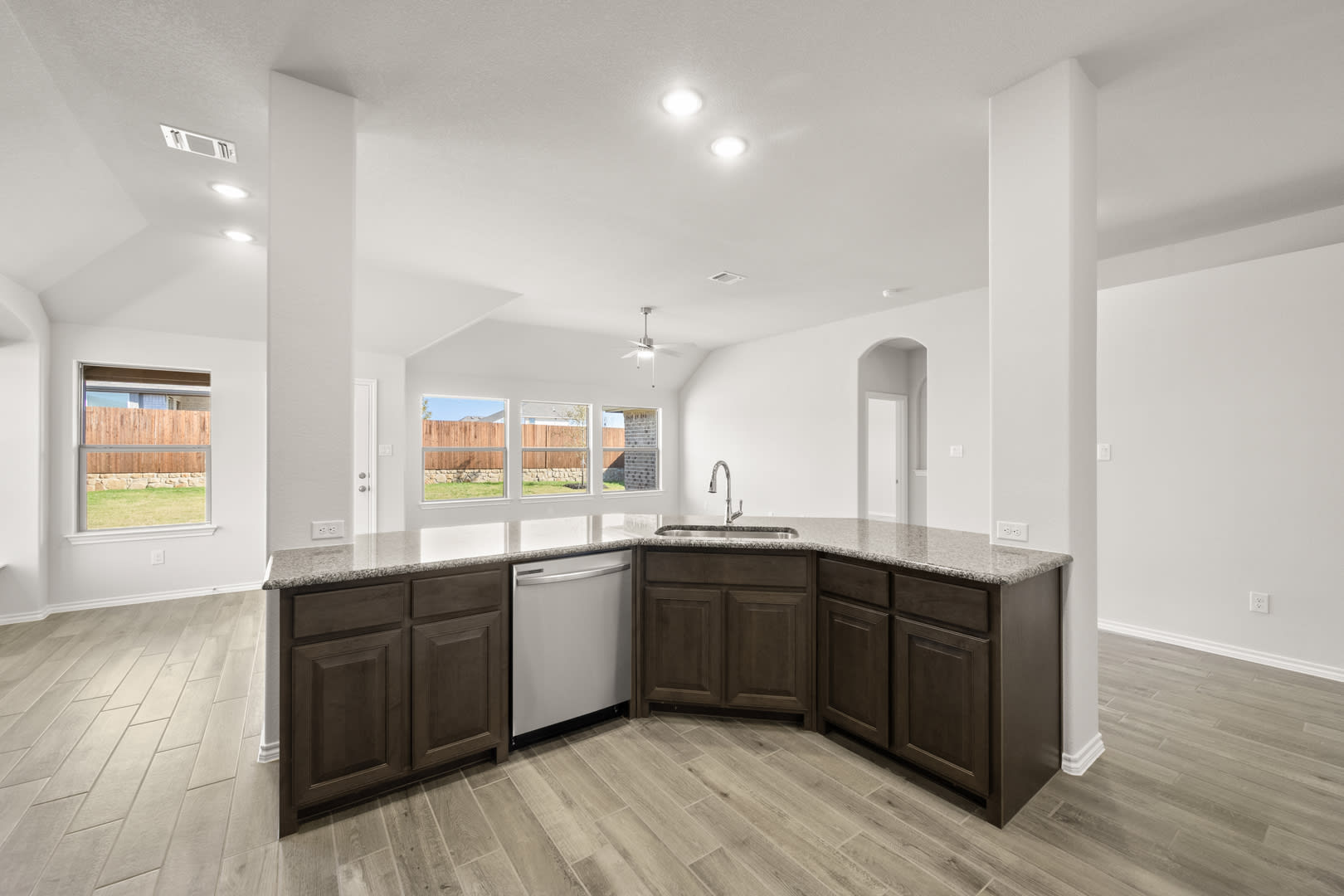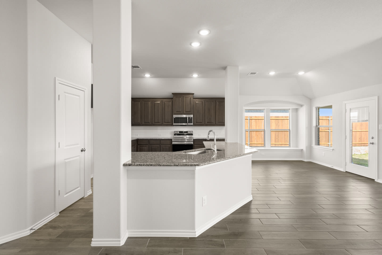 This home strikes the perfect balance of function and flow, offering three spacious bedrooms and two full bathrooms all on one level. As you enter through the foyer, you’re welcomed into an open-concept living space where the kitchen, family room, and nook come together beautifully for both everyday life and entertaining. The kitchen features a unique angled island with bar seating, abundant counter space, and direct access to a walk-in pantry and utility room. The secluded primary suite at the back of the home offers privacy and comfort with a walk-in closet, a soaking tub, separate shower, and dual sink vanity in the en-suite bath. Secondary bedrooms are tucked toward the front of the home with a shared full bath, ideal for guests or kids. Enjoy your mornings or unwind in the evenings on the covered patio just off the nook. A two-car garage and smart layout make this home as practical as it is charming.